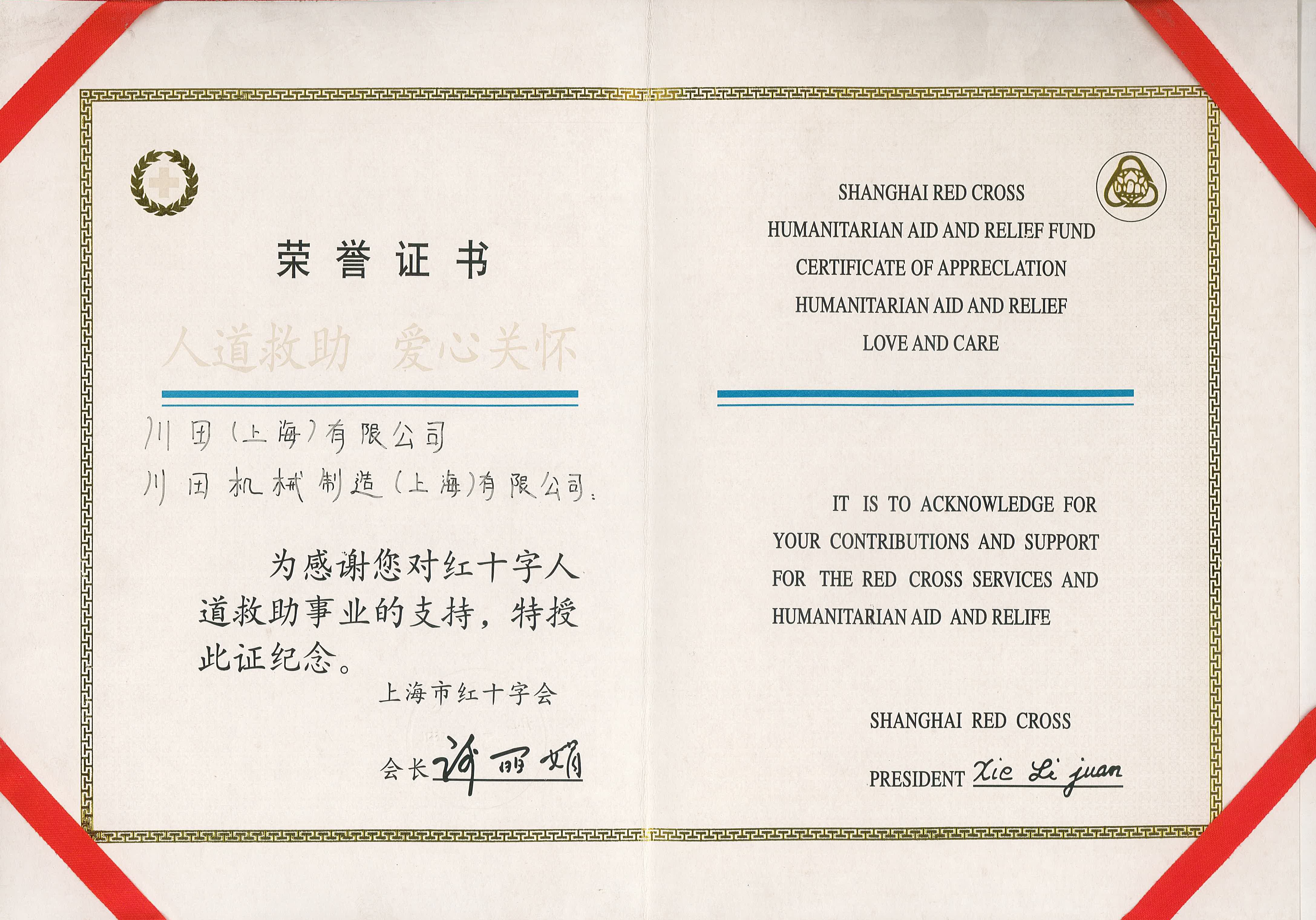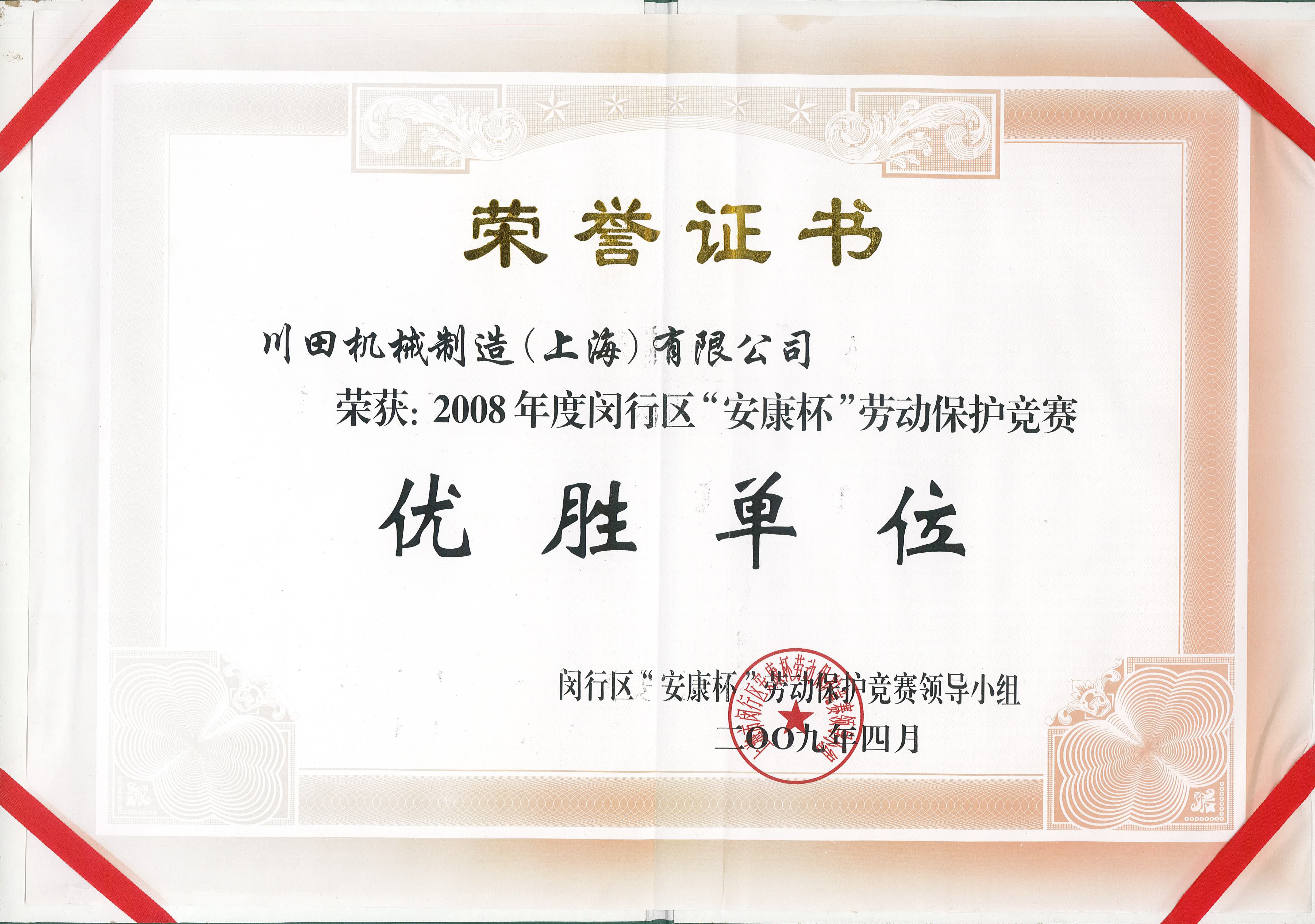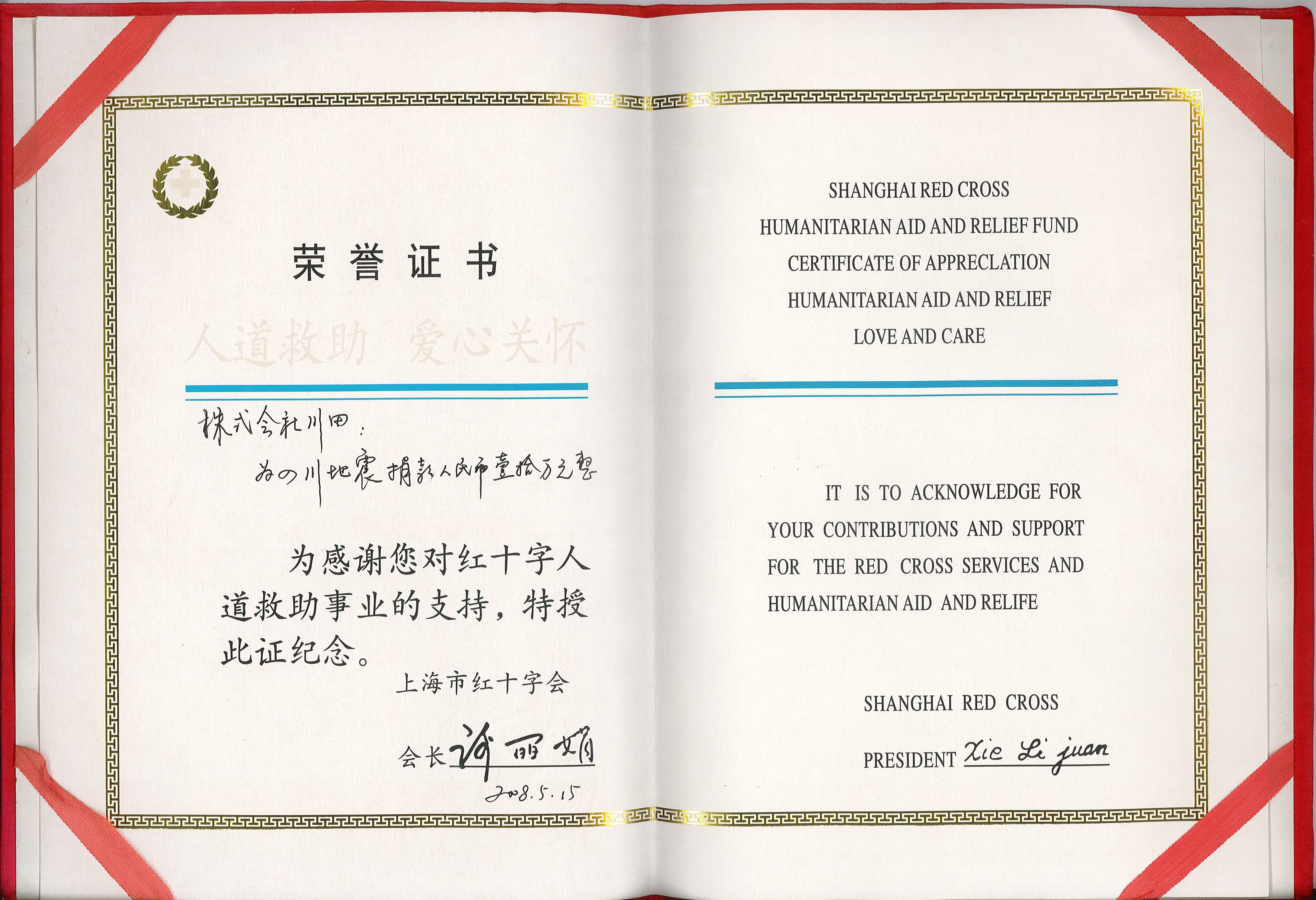 2008年度上海市赤十字栄譽証書-川田株式會社